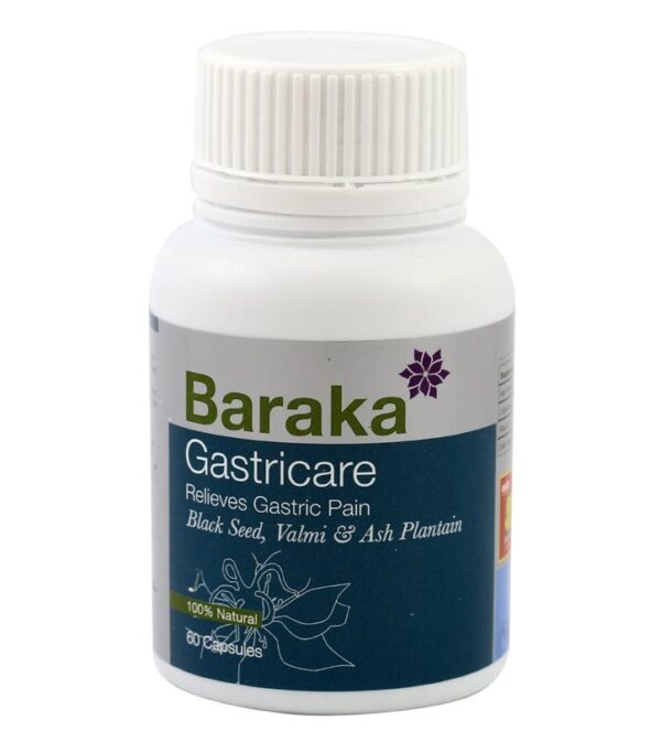 Baraka gastricare is a hard gelatin capsule which is manufactured out of black seed powder, licorice powder, and ash plantain powder. A combination of three powders helps to reduce the instant pain of gastritis, heal gastric ulcers and reduce burning sensation in the stomach and duodenum.